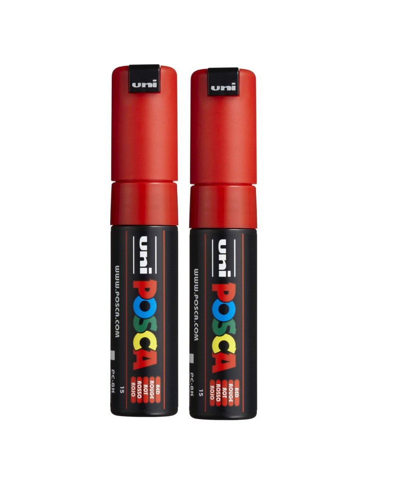 Create bold, high-impact marks with the POSCA PC-8K Paint Markers, Broad Chisel Tip (8 mm), Red. Designed for large-scale artwork, lettering, murals, and expressive mixed-media applications, these markers deliver rich, opaque color on nearly any surface, including paper, canvas, wood, plastic, metal, glass, stone, ceramic, and fabric. The 8 mm chisel tip provides dynamic line variation, offering both wide coverage and sharp, clean edges, making it ideal for posters, signage, backgrounds, and graphic illustration. POSCA’s water-based, quick-drying paint applies smoothly, dries to a matte finish, and resists smudging and fading. The valve-controlled ink system ensures consistent paint flow, and the durable tip can be reversed or replaced for extended use. Whether in the studio, classroom, or creative workspace, PC-8K markers offer reliable, vibrant performance for artists who want bold strokes and confident color. Sold as a pack of 2.