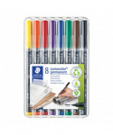 Staedtler Lumocolor Permanent is universal, fast-drying, permanent pen for almost all surfaces including overhead projections. The medium nib 1.0 mm allows for solid line weights, perfect for lettering and writing. The lightfast, low-odor ink is smudge-proof and waterproof on almost all surfaces. Dry-Safe ink can be left uncapped for 2 days without drying up. Suitable for travel, this airplane-safe pen has automatic pressure equalization that prevents it from leaking on board aircrafts. This set comes with 8 colors: yellow, orange, red, purple, blue, green, brown, and black.