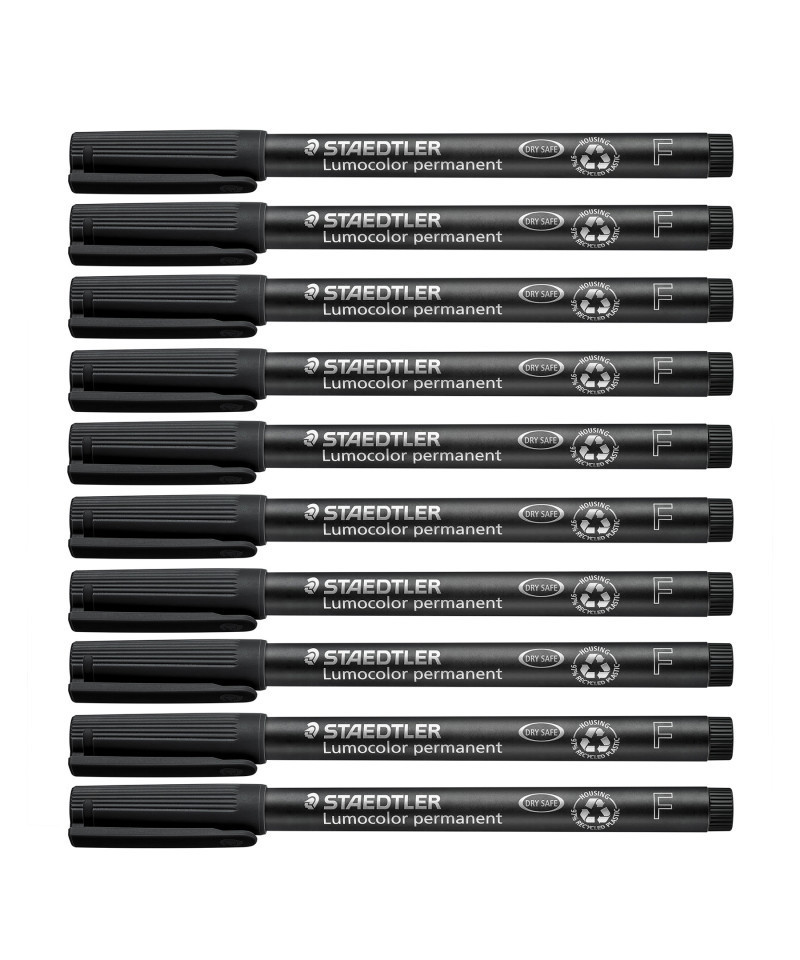 Staedtler Lumocolor Permanent is universal, fast-drying, permanent pen for almost all surfaces including overhead projections. Staedtler's line of Lumocolor marker pens come in fine line width (0.6 mm) and a pack of 10 black pens for hours of creativity, or long, hard use in the office. And they are eco-friendly, made from 97% recycled plastic! When the pros need durability and precision, they turn to Staedtler. Whether it's scientific or creative endeavors, in the home, office or classroom, Staedtler helps bring ideas to life.
