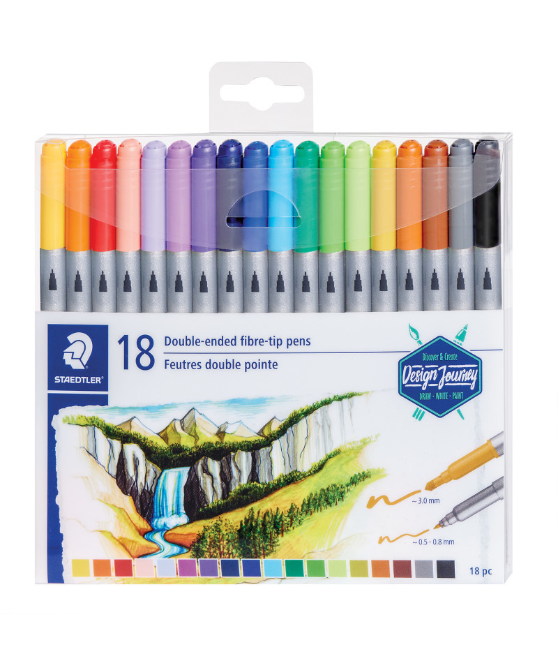 Staedtler Double-Ended Fiber-Tip Pens have two tips in one pen for versatility in writing, drawing, and coloring. Each pen features a fine point tip (approx. 0.5–0.8 mm line width) and a broad, pressure-resistant tip (approx. 3.0 mm line width). This allows for detailed work as well as filling in larger areas. A great starter collection of 18 double-ended fiber tip pens in a variety of colors.