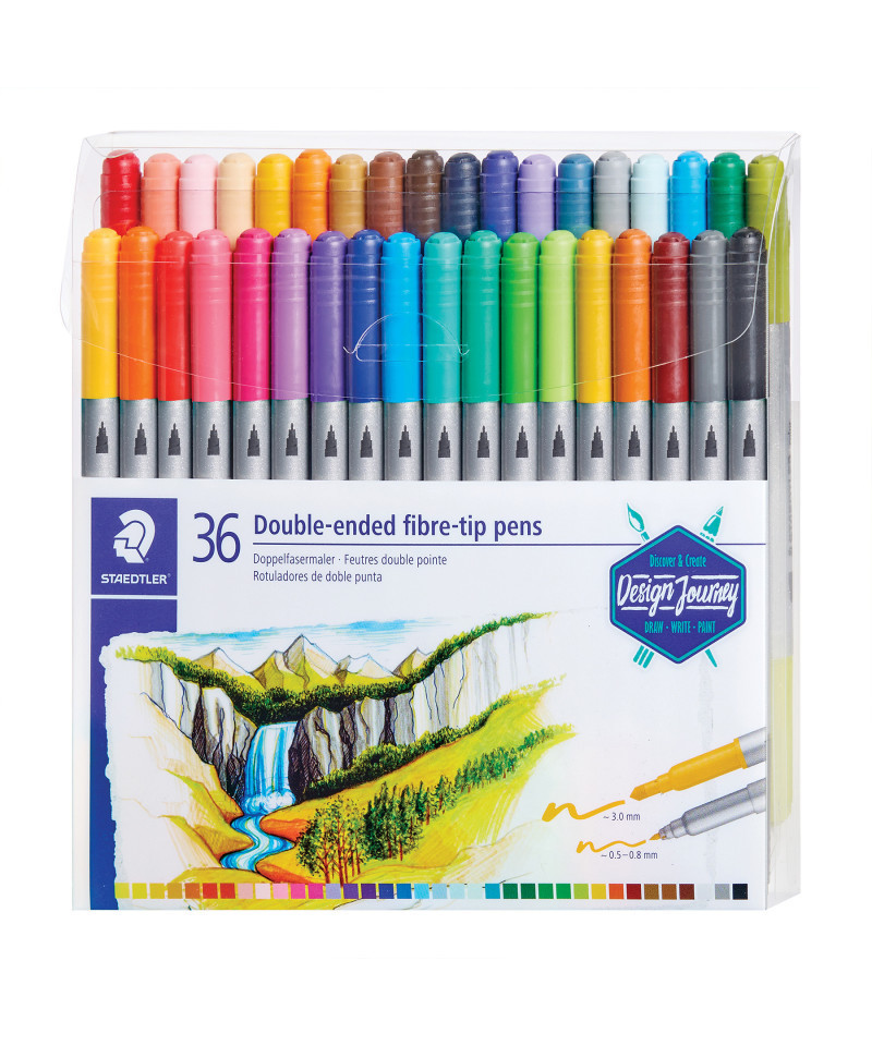 Staedtler Double-Ended Fiber-Tip Pens have two tips in one pen for versatility in writing, drawing, and coloring. Each pen features a fine point tip (approx. 0.5–0.8 mm line width) and a broad, pressure-resistant tip (approx. 3.0 mm line width). This allows for detailed work as well as filling in larger areas. A broad collection of 36 double-ended fiber tip pens in a variety of colors.