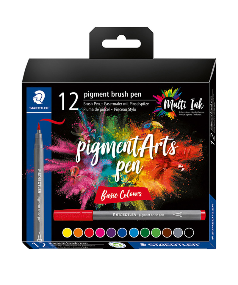 Immerse yourself in a world of brilliant and vibrant colors! This Staedtler Pigment Arts Pen Set features New Multi Ink technology with premium pigments which means that you can achieve extreme lightfastness and exceptional color brilliance on a wide range of surfaces even after years of UV exposure. It is ideal for brush lettering, drawings, illustrations, or coloring. Transform your art into vivid and long-lasting masterpieces. Get Multi creative! This set of 12 basic colors allows you a wide range of creative choices!