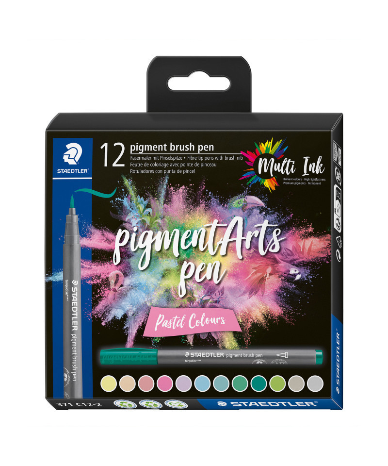 Immerse yourself in a world of brilliant and vibrant colors! This Staedtler Pigment Arts Pen Set features New Multi Ink technology with premium pigments which means that you can achieve extreme lightfastness and exceptional color brilliance on a wide range of surfaces even after years of UV exposure. It is ideal for brush lettering, drawings, illustrations, or coloring. Transform your art into vivid and long-lasting masterpieces. Get Multi creative! This set of 12 pastel colors allows you a wide range of creative choices!