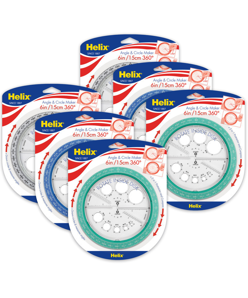 The 360° Angle & Circle Maker combines 3 Geometry tools into 1 innovative & exciting product! The 6" diameter outer ring acts as a classic protractor, while the separate inner circle easily rotates to draw circles just like a compass. And the 8 integrated circle templates built into the inner ring for drawing accurate small circles far easier than using a standard compass. Unique product is much easier for young children to manipulate and use than a standard compass, and the integrated design means that they can more easily understand how angles and measurements correspond with each other. The perfect tool for young students working on mastering geometry and angles! Sold as a pack of 6 in assorted colors: Blue, Teal and Grey (no color choice).