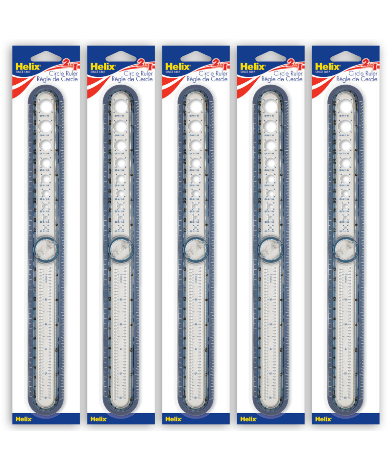 This innovative 3-in-1 ruler and compass makes it easy to draw precise circles up to 12" in diameter! For larger circles, simply place pen or pencil in the appropriate hole (1/8" increments), hold the center disk, and sweep the ruler around it's center point. Smaller circles, from 1/16" to 9/16" diameter, are easily drawn with the integrated circle templates into the ruler body. And along the outer edge of the ruler are 12" & 30cm graduations perfect for measuring! Unique product is much easier for young children to manipulate and use than a standard compass, and the integrated design means that they can more easily understand how angles and measurements correspond with each other. The perfect tool for young students working on mastering geometry and angles! Sold as a pack of 5 Measuring & Compass Tools.