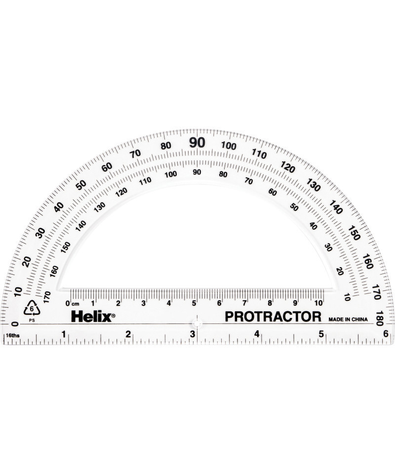 The classic school protractor! This 180 degree protractor is made of crystal clear plastic construction so you can easily see the angle you're drawing, and features 6" and 10cm rulers for easy measuring. Integrated centering hole is easy to set at the angle start point, and the angle graduations allow you to measure angles right to left or left to right. Protractor edge features beveled edges for clean, accurate lines!
