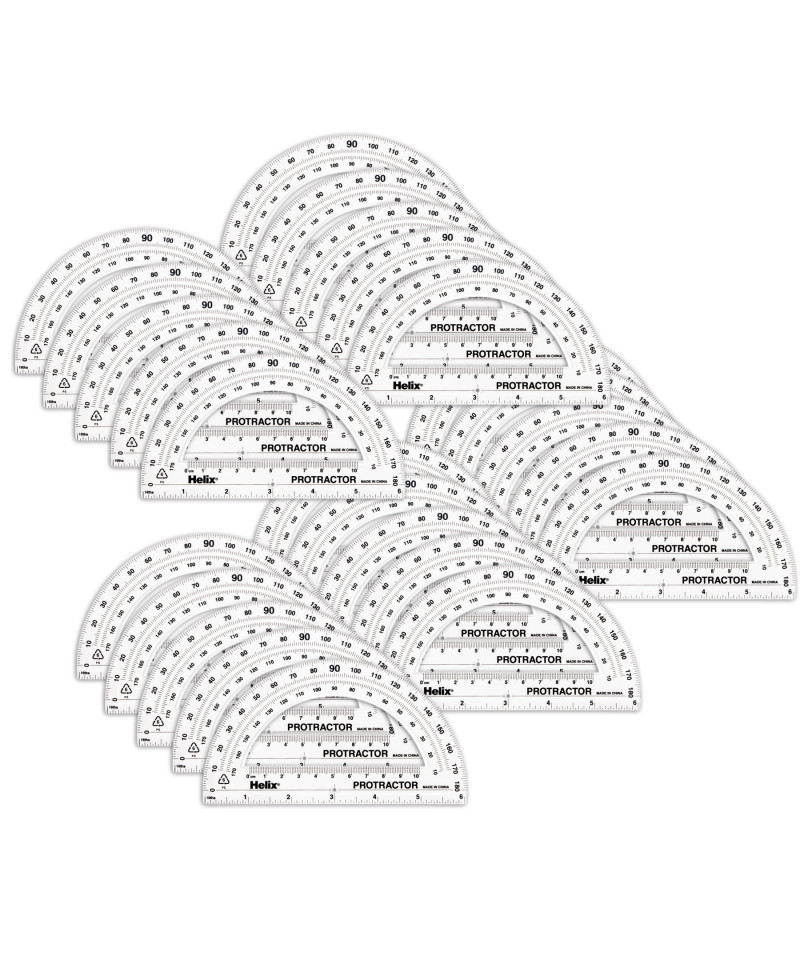 The classic school protractor! This 180 degree protractor is made of crystal clear plastic construction so you can easily see the angle you're drawing, and features 6" and 10cm rulers for easy measuring. Integrated centering hole is easy to set at the angle start point, and the angle graduations allow you to measure angles right to left or left to right. Protractor edge features beveled edges for clean, accurate lines! Sold as a pack of 25 protractors.