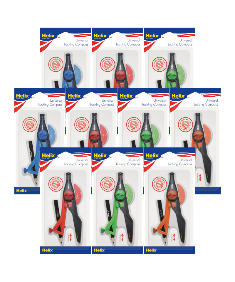 Modern, ergonomic compass perfect for all ages! Features a twist-lock secures the legs in place for accurate circle size and guaranteed precision. Innovative Safety Tip automatically retracts when you close the compass legs, to avoid potential injuries in a bag or case. Integrated distance measuring arm is graduated in both inch and metric. Sold as a pack of 10 compasses in assorted colors (no color choice): Blue, Green, Red and Orange.