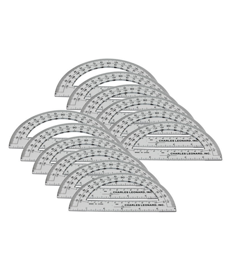 The Charles Leonard Protractor Plastic is a must-have tool for young mathematicians. This pack of 12 6-inch clear plastic protractors is perfect for students learning about angles. The protractor features an open center and a 6-inch ruler at the base, with measurements in both metric and inches. The sharply defined graduations make it easy for students to identify angles from 0 to 180 degrees, helping to minimize visual errors. The easy-to-read numbers and clear transparent plastic make this protractor durable and long-lasting, ensuring it will be a staple in any classroom or home learning environment.