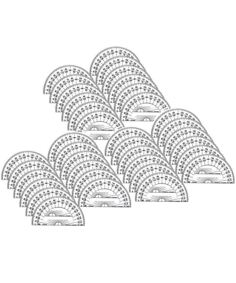 The Charles Leonard Protractor Plastic, 4-Inch, is the perfect tool for young mathematicians to accurately measure angles. Made of clear plastic, this protractor features an open center and sunburst at the base, making it easy for students to identify angles from 0 to 180 degrees. The sharply defined graduations on the protractor are easy to read, helping to minimize visual errors. Each pack includes 12 protractors and there are plenty to go around in the classroom or at home. Sold as 3 packs for a total of 36 protractors.