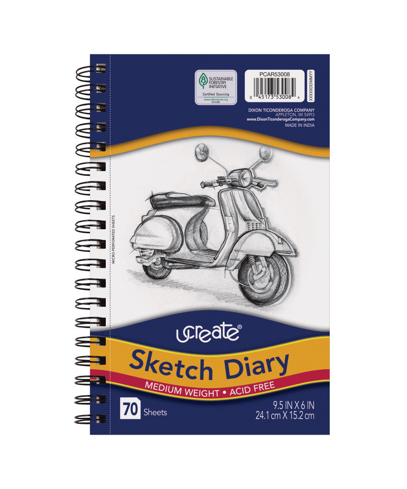 Medium weight sketch diary features bright white paper that is acid-free. Sheets are perforated for final art. Spiral bound on the side. Ideal for dry media. Each diary includes 70 sheets.