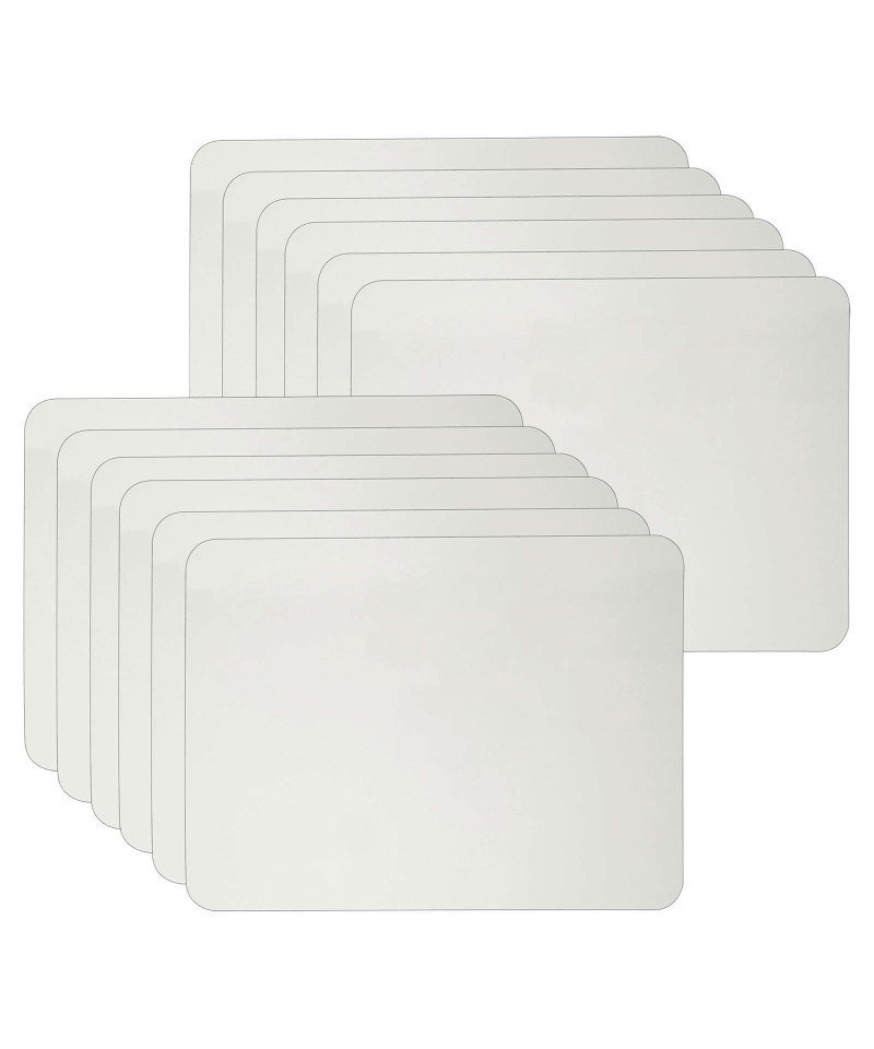 Great for classroom games, math lessons, reminders and all assignments. Durable masonite lap boards are 9" x 12" and can be used with all dry erase markers. An environment friendly way to learn, as you just write, wipe off and re-use with no waste. Plain on one side. Pack of 12 boards.