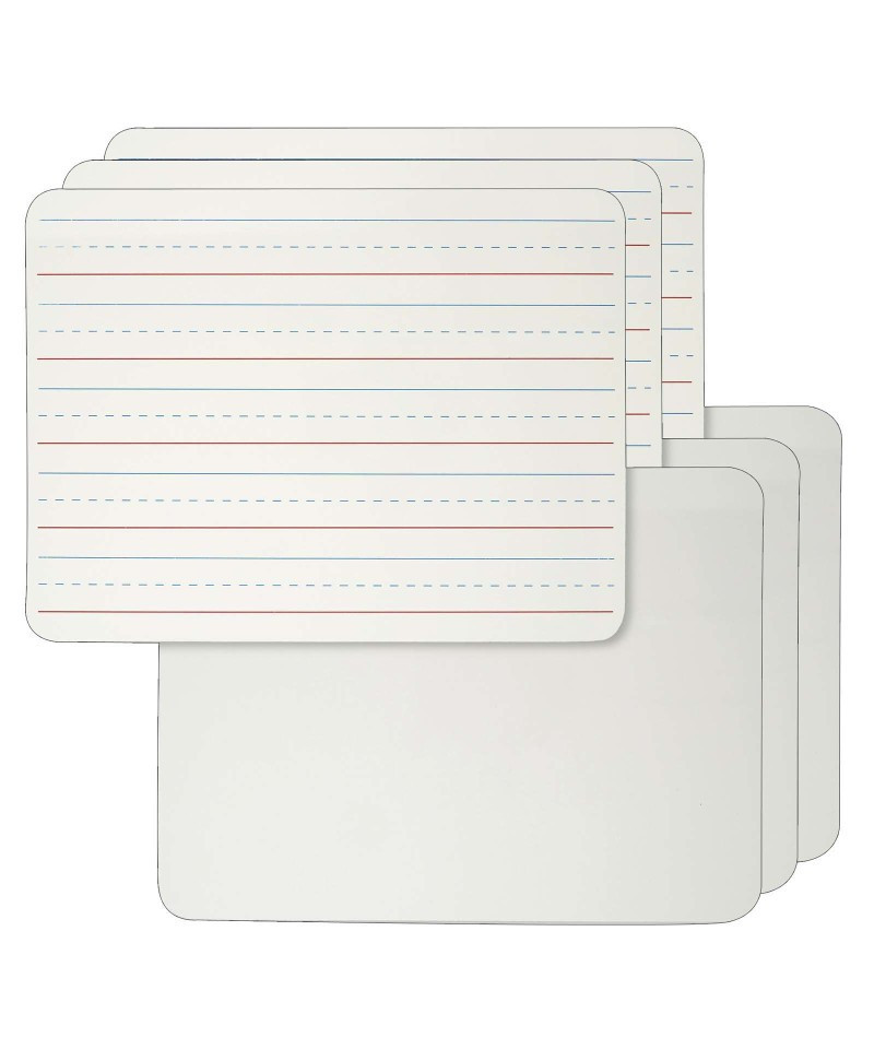 Dual sided, pre-printed lines on one side and blank on the other offers endless uses. Blank side works great for classroom games, math lessons and reminders. While our pre-printed side is great for penmanship and sentence writing. Durable masonite lap boards are 9" x 12" and can be used with all dry erase markers. An environment friendly way to learn, as you just write, wipe off and re-use with no waste. Pack of 6 boards.