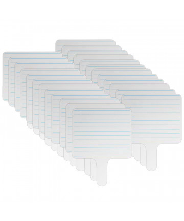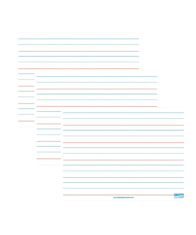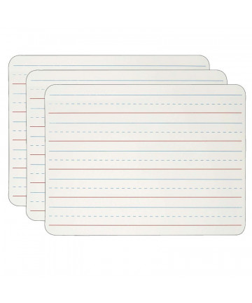 Ideal for teaching and practicing fundamentals for early learners and for use with magnetic manipulatives. Bright white board contains 5 sets of blue headline and broken midline plus red baseline format. Each line set measures 1-1/8" with 3/8" of blank descender space between sets. Back side is magnetic, plain, white dry erase. Boards feature a non-ghosting dry erase surface with rounded corners and smooth edges for comfort and safety. Backing is warp and chip resistant. Measure 12" x 9" x 0.125" thick. Pack of 3 Dry Erase Boards.