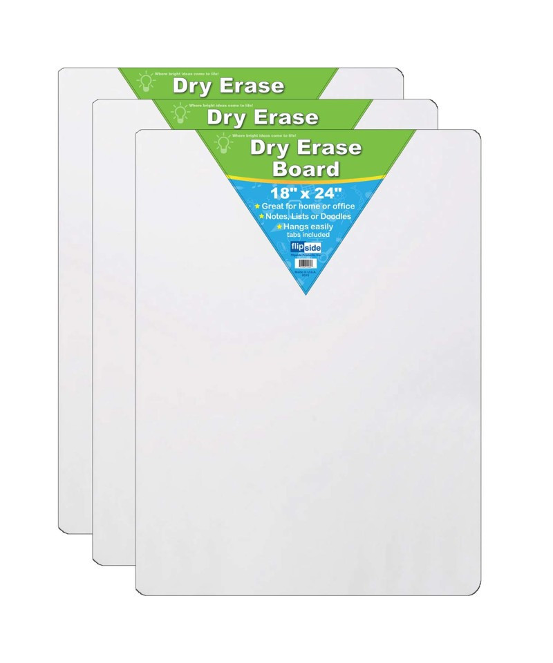 Economical, unframed board with a plain dry erase surface is ideal for doodling, academic lessons, agendas, and more! Quality write-and-wipe surface is non-ghosting. Hardboard backing is warp and chip resistant. Rounded corners and smooth edges for comfort and safety. Adhesive squares included for mounting. Measures 18" x 24" x 0.125". Pack of 3 Dry Erase Boards.