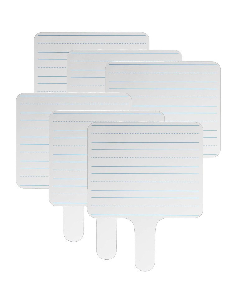The two-sided rectangular dry erase writing paddles are ideal for quick responses or lessons. One side features lines for handwriting practice or sentence structures, reverse side features a blank dry erase side. Measures 7.75" x 10", and 1/8" thick. Sold as a pack of 6 paddles.