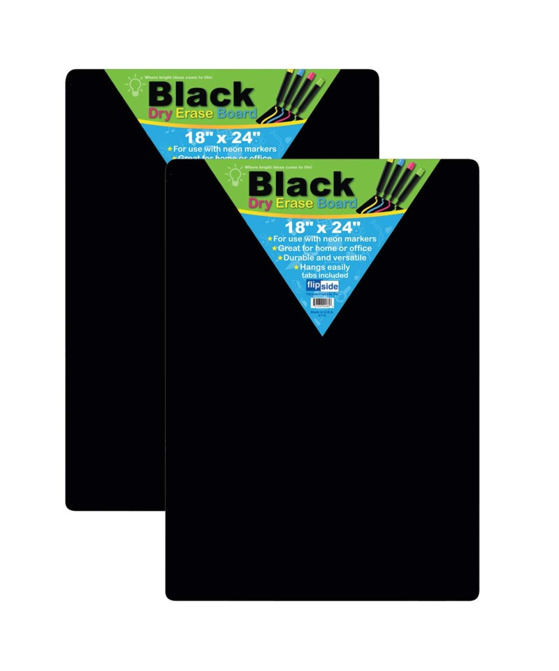 Use neon dry erase markers on this economical, unframed board with a plain black dry erase surface for doodling, academic lessons, agendas, and more! Quality write-and-wipe surface is non-ghosting. Hardboard backing is warp and chip resistant. Rounded corners and smooth edges for comfort and safety. Adhesive squares included for mounting. Measures 18" x 24" x 0.125". Pack of 2 boards.