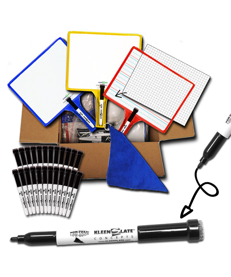 KleenSlate's award-winning customizable whiteboards with snap-in marker and eraser are the most dynamic, fun and engaging dry erase tools on the market. With clear dry erase sleeves for interchangeable graphic organizers, teachers can now customize the whiteboards to fit their needs. Paddles are blank dry erase surface on one side and clear dry erase sleeve on the other. Set includes 24 whiteboards, 24 dry erase black markers with eraser, 24 microfiber cloths with bookbinder rings 14" x 7", and 24 graph/lined templates.