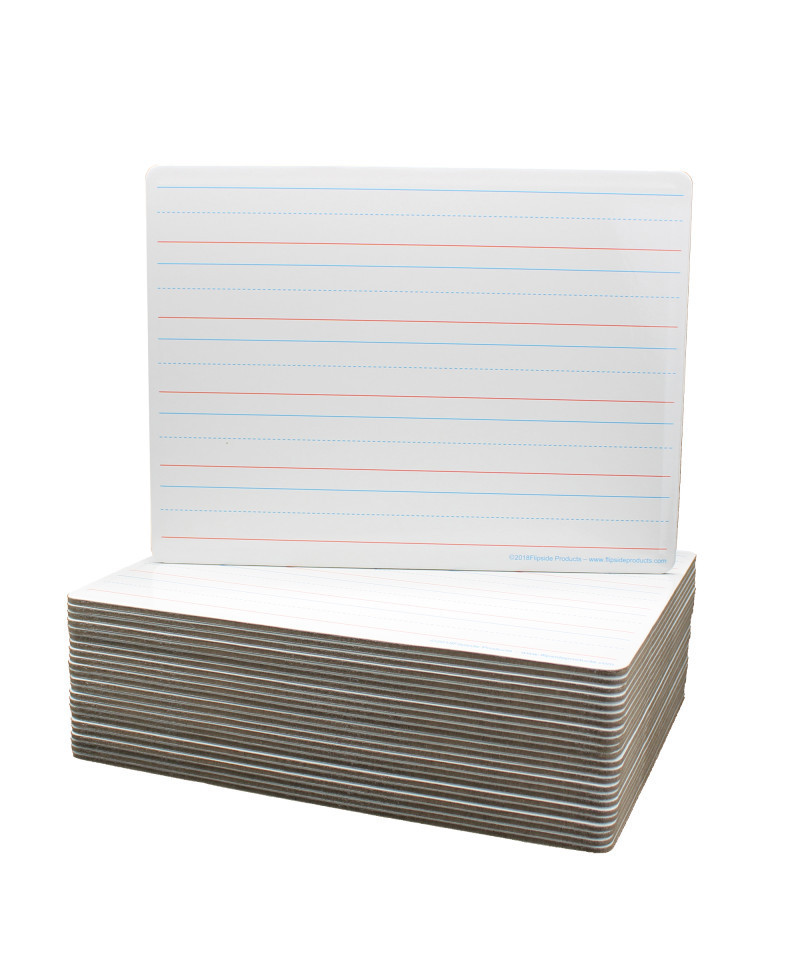 Ideal for teaching and practicing fundamentals for early learners and for use with magnetic manipulatives! Bright white board contains 5 sets of blue headline and broken mid-line plus red baseline format. Each line set measures 1 1/8" with 3/8" of blank descender space between sets. Back side is magnetic plain white dry erase. Boards feature a high-quality, non-ghosting write-and-wipe surface with smooth, rounded edges and corners. Hardboard backing is warp and chip resistant. Measure 12" x 9" x 0.125" thick. Class pack of 24.