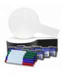 Quick and quiet whole class participation made easy with Mini Answer Paddles. Great for review sessions, surveys, assessments, and more! Non-ghosting dry erase surface with a rounded shape, an easy grip handle and smooth edges. Hardboard backing is warp and chip resistant. Make everything more fun with dry erase paddles. Paddles measure 5"W x 9"T. Set of 12 paddles, 12 erasers, and 12 assorted color markers (3 of each color; red, blue, purple, and green).