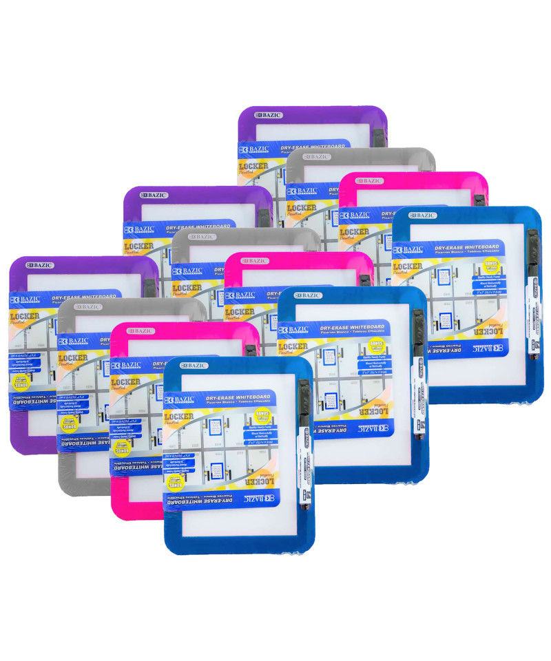 Magnetic Locker Dry Erase Board 5" X 7" with marker. Each board includes 2 magnets to hold the dry erase board to a locker or onto other smooth metal surfaces such as a refrigerator. Writing board is framed in bright colors. Size: 5" x 7". Each board comes with 1 dry erase marker with eraser on the top. Great accessory for school, college students, and on the go travelers. Sold as a pack of 12 boards, each with marker and mounting magnets.
