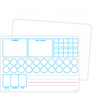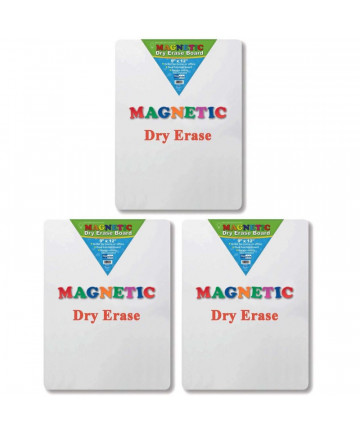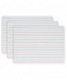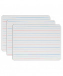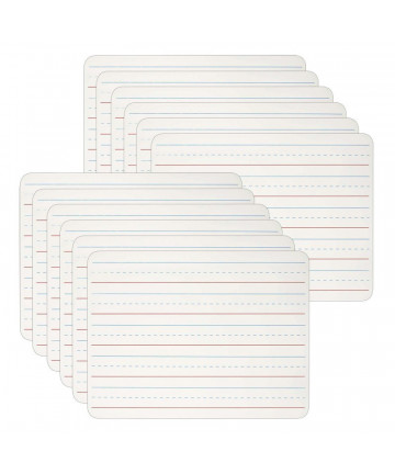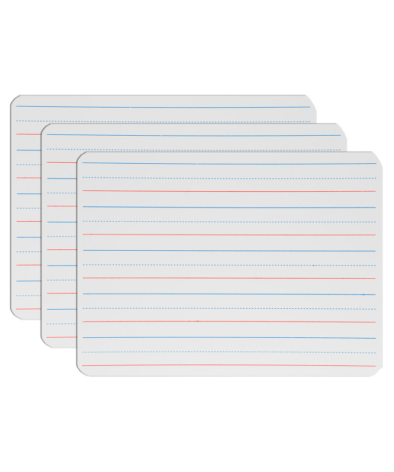 Ideal for teaching and practicing fundamentals for early learners and for use with magnetic manipulatives. Bright white board contains 5 sets of blue headline and broken midline plus red baseline format. Each line set measures 1-1/8" with 3/8" of blank descender space between sets. Back side is magnetic, plain, white dry erase. Boards feature a non-ghosting dry erase surface with rounded corners and smooth edges for comfort and safety. Backing is warp and chip resistant. Measure 12" x 9" x 0.125" thick. Pack of 3 Dry Erase Boards.