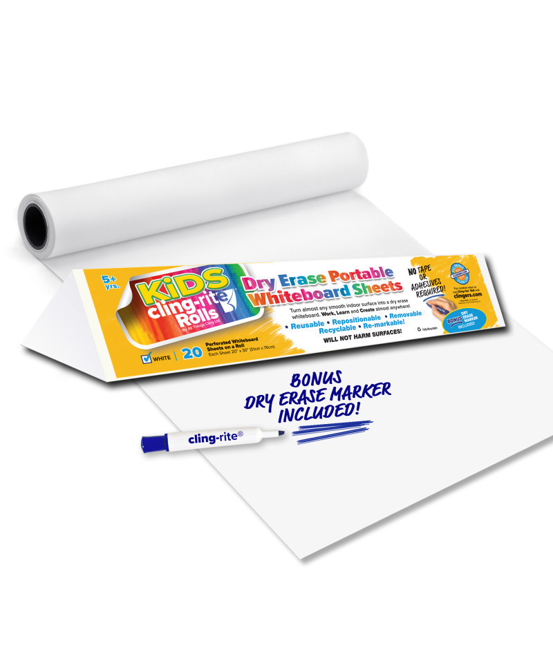20 white dry erase sheets on a 50 foot roll. Each perforated Cling-rite® Roll sheet is 20 x 30 inches. Cling dry erase sheets to most indoor smooth surfaces. They are repositionable, erasable, recyclable and remarkable. Reuse with dry erase or low odor markers, or use other markers or acrylic paint for single use. Will not harm surfaces. Cling lightweight paper onto the surface for storyboarding, or under it for tracing images, no tape or adhesive required. Perfect for the home office, distance learning, home school, and art projects. Cling-rite® is safe and easy to use. Cling-rite® sheets are reusable and very easy to move from one location to another. No adhesives, will not leave residue.