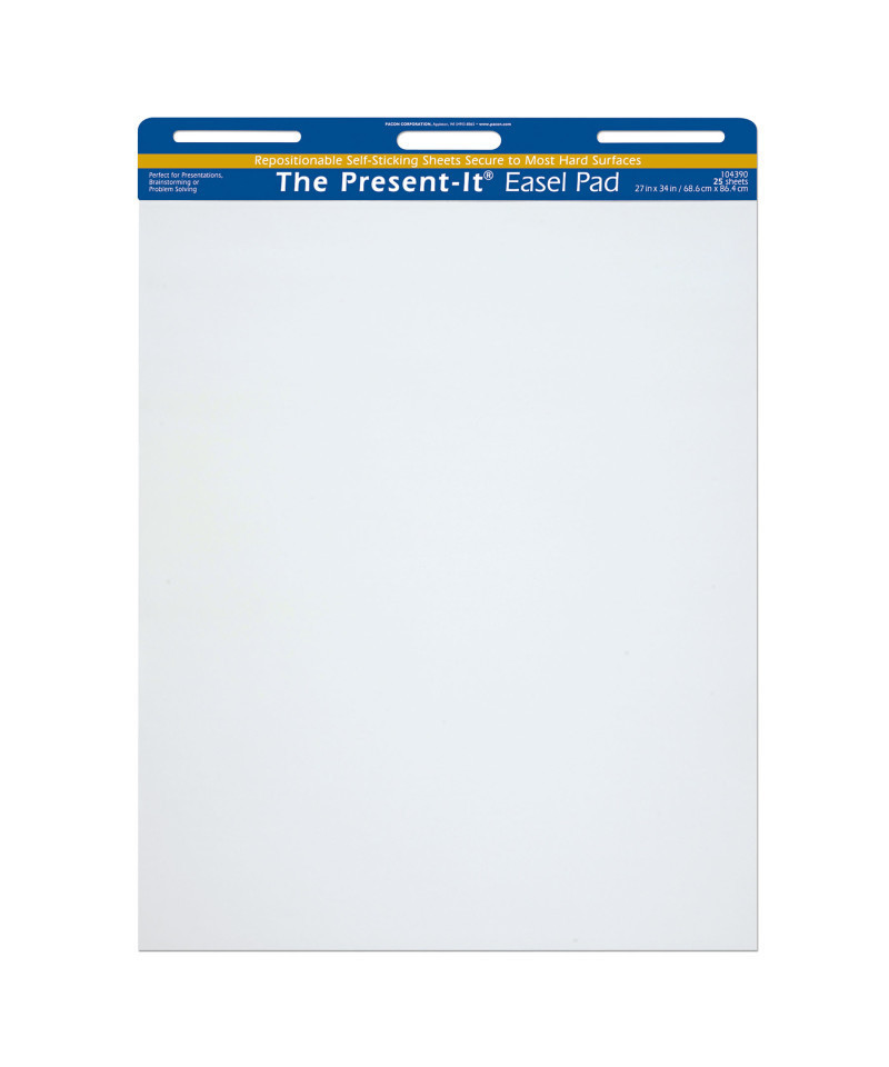 Self-adhesive sheets are perfect for presentations, brainstorming or problem solving exercises. Sheets are bleed-through resistant, pull off easily and stick securely to most hard surfaces. No tape, tacks or staples needed. Remove or reposition without leaving residue behind. Works great for classroom anchor charts. Includes a convenient handle for easy transportation. Recyclable. Measures 27" x 34". Each easel pad includes 25 sheets.