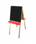 The double-sided wooden art easel was designed specifically for children under the age of 6. It features a lead-free black chalkboard on one side and a white dry-erase board on the reverse, providing room for creativity and countless hours of fun. The two built-in rugged plastic trays easily hold chalk and markers. The easel easily folds flat for quick storage, with finger friendly leg brackets to prevent pinching. The solid wood construction is perfectly sized at 44"T x 19"W.