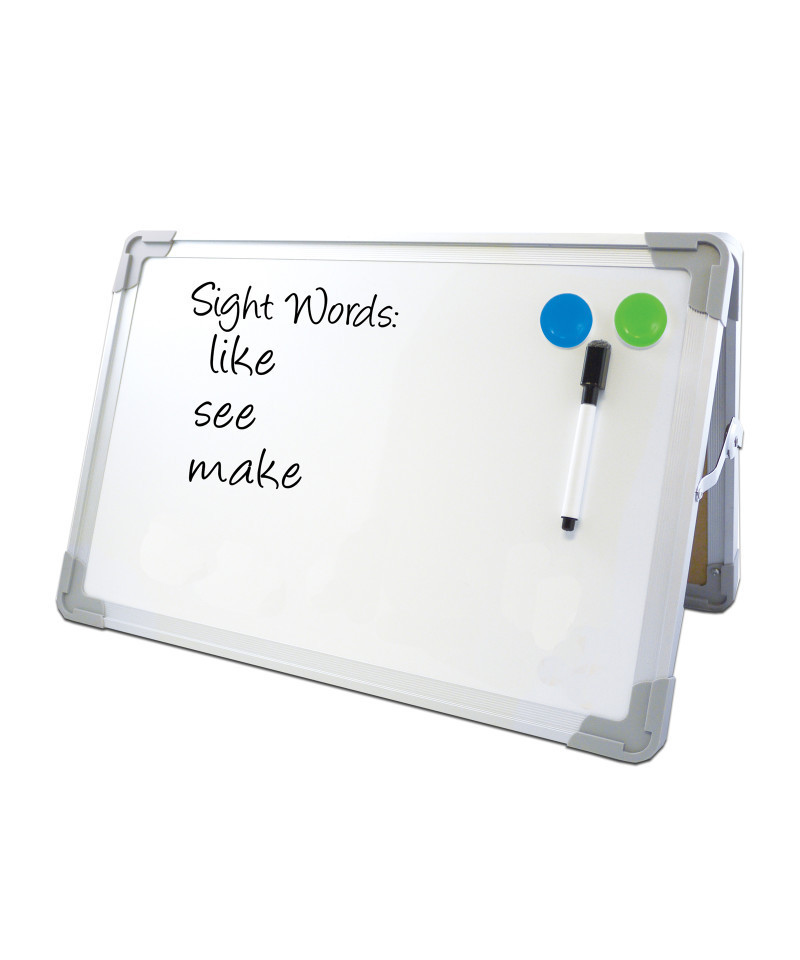 Ideal for small-group learning activities, this versatile double-sided easel brings interactivity to a child's fingertips! Features two magnetic dry erase surfaces, one dry erase pen with magnetic eraser cap, and two colorful disk magnets. Lightweight aluminum frame with rounded plastic corners for style and safety folds flat for easy storage. Overall closed dimensions are 20" x 16" x 1.75" deep. Opens to 10.5" deep with locking hinges for stability and safety.