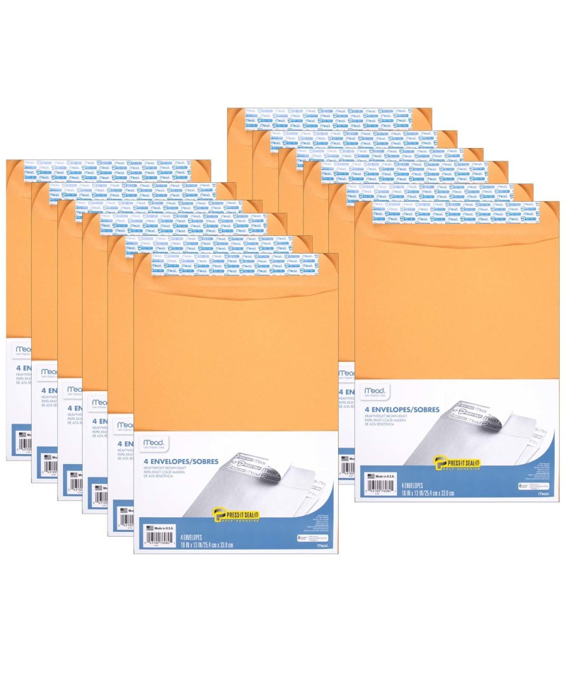 Mead® Press-It Seal-It® Envelopes feature a self-adhesive seal and brown kraft material. Envelopes measure 10" x 13" in size. Includes 4 envelopes per pack. Sold as 12 packs for a total of 48 envelopes.