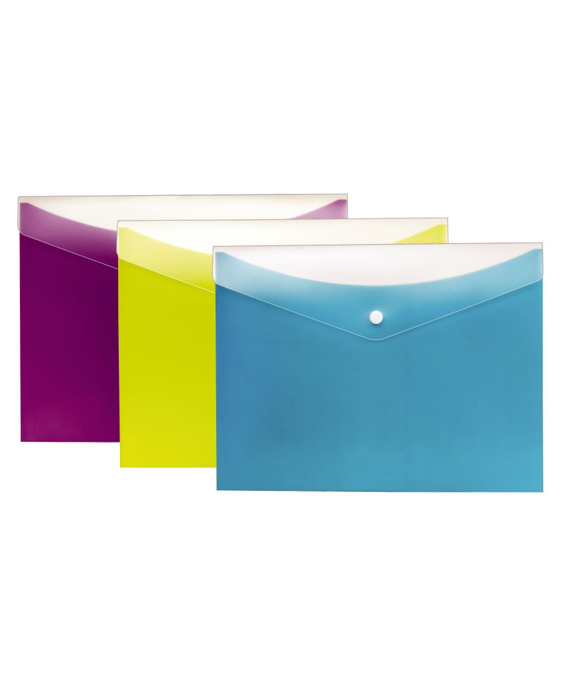 Poly envelope has additional pocket on back. Snap closure keeps contents secure. Top loading. Letter Size. Durable poly is water and tear-resistant. Assorted. Each pack includes 3 envelopes.