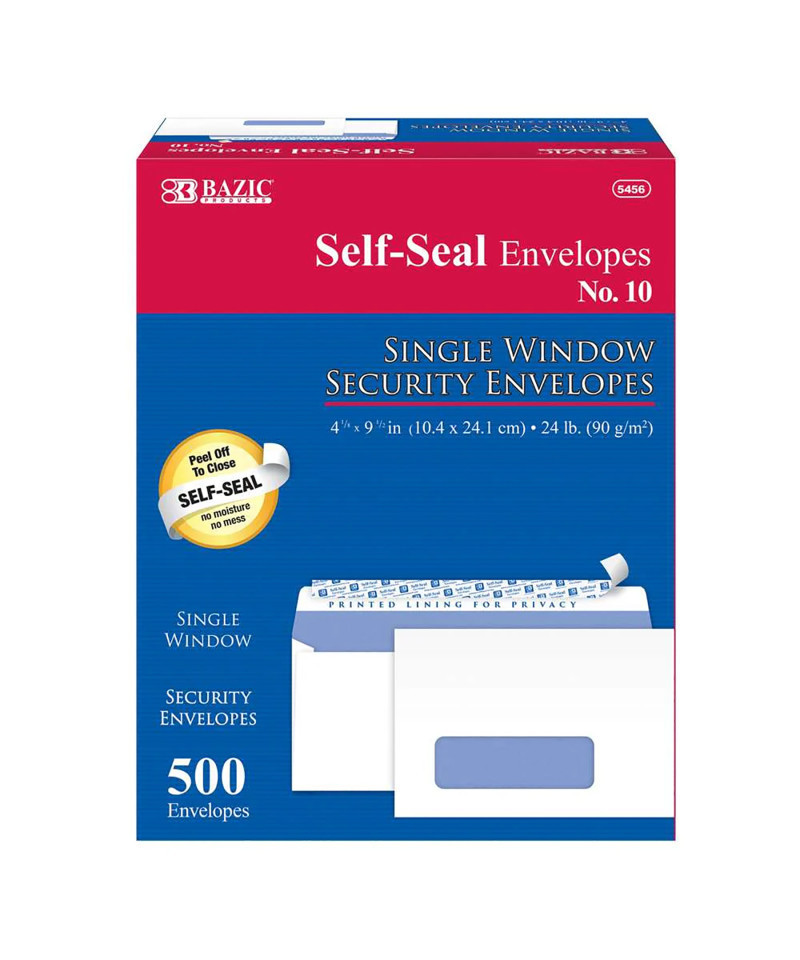 The single window design eliminates the need to print or handwrite addresses. In our #10 window envelopes, the large, easy-to-read poly window is positioned perfectly for displaying addresses or business information. These self-sealing windowed envelopes measure 4 1/8" x 9 1/2" inches and are designed to save you time and money, allowing you to fly through mailings in record time. They provide a secure solution—just peel and seal to create a strong, lasting seal without the need for moistening. Our self-seal design is quick and easy, and it is guaranteed to stay sealed without requiring tape or glue sticks. Crafted from durable 24lb paper, these standard white envelopes are perfect for everyday business use and feature a security tint designed to protect contents and sensitive information. Additionally, these envelopes can easily accommodate invoices, letters, checks, gift cards, and more, making them versatile for virtually any need. Each box includes 500 envelopes.