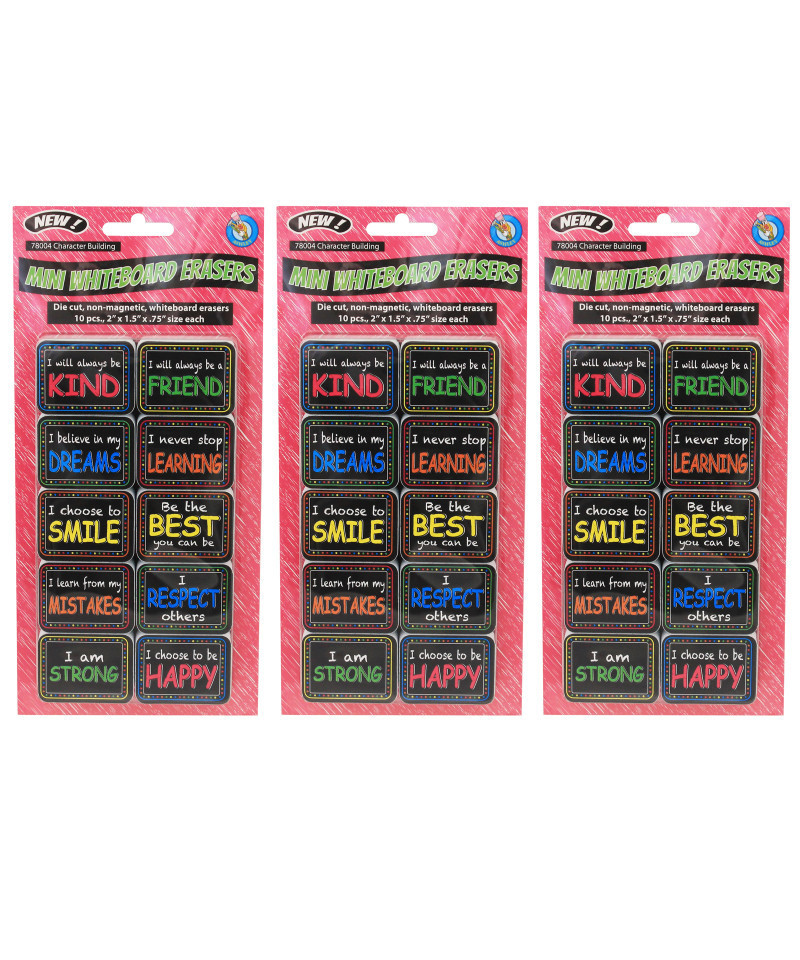 Ashley Productions® Non-Magnetic Mini Whiteboard Erasers, Character Building, 10 Per Pack, 3 Packs