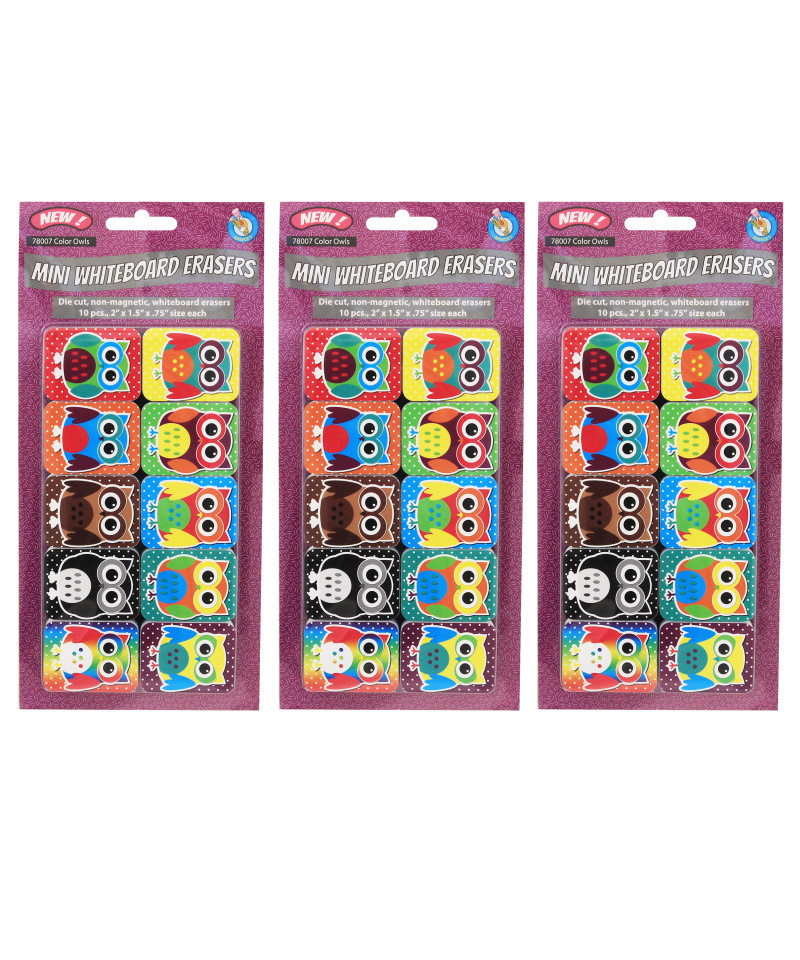 Ashley Productions® Non-Magnetic Mini Whiteboard Erasers, Color Owls, 10 Per Pack, 3 Packs