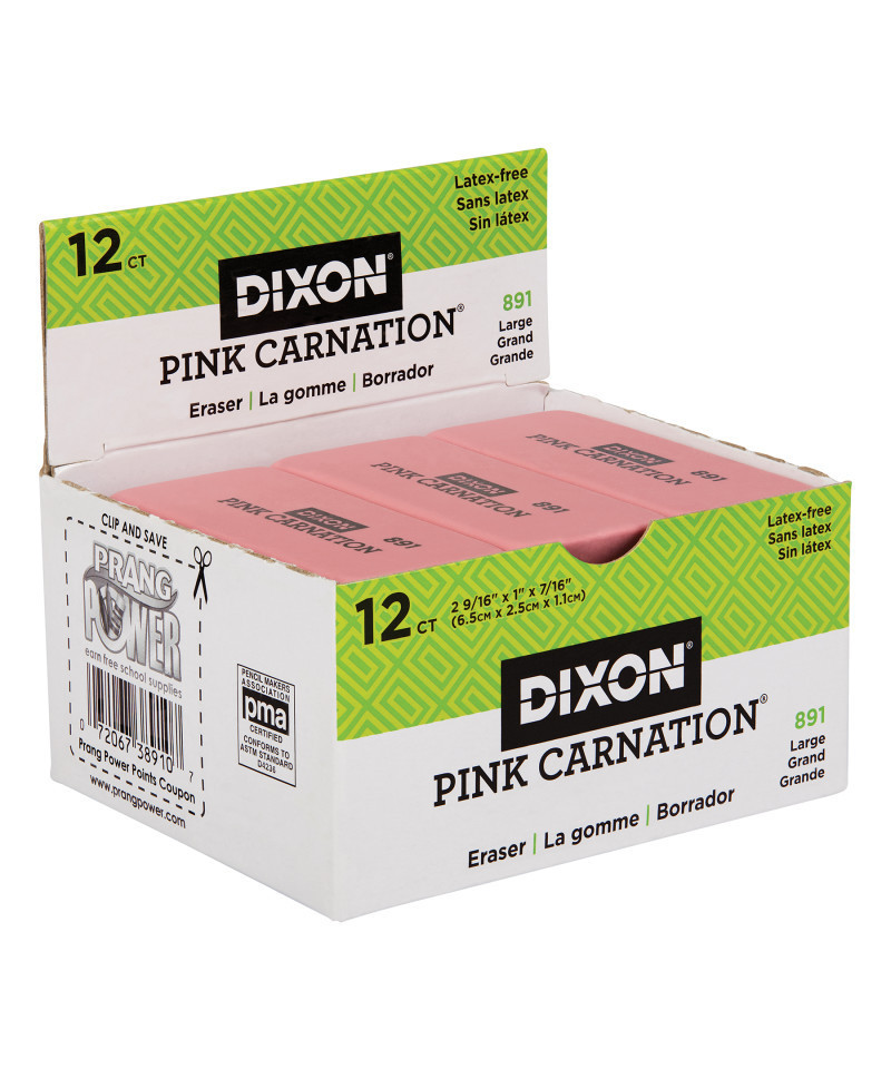 Pink Carnation Erasers by Dixon are the traditional office choice. Beveled edges give you more control over what you take off the page and what stays put. These soft, latex-free pink erasers cleanly remove black pencil marks, leaving you with a clear, smudge-free surface. PMA certified non-toxic. Erasers measure 2-9/16" x 1" x 7/16". Each pack includes 12 erasers.