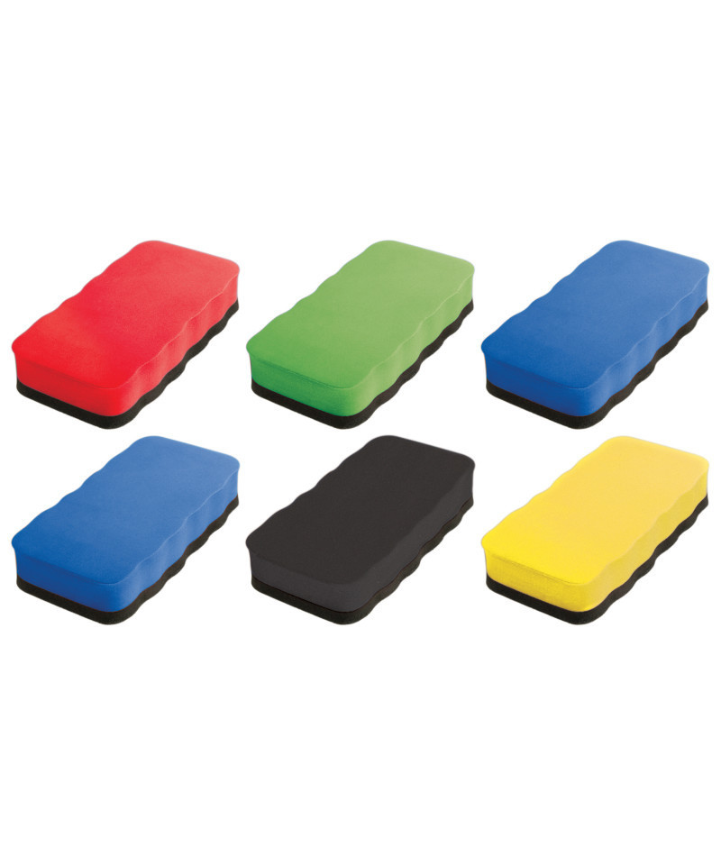 No storage tray on your whiteboard? No problem! Conveniently adheres to any magnetic-receptive surface. Features lightweight, durable foam with contoured comfort grip, and felt eraser surface. Eraser measures 4 1/2" X 2 1/2" X 7/8". Sold as a pack of 6 erasers in assorted colors (no color choice).