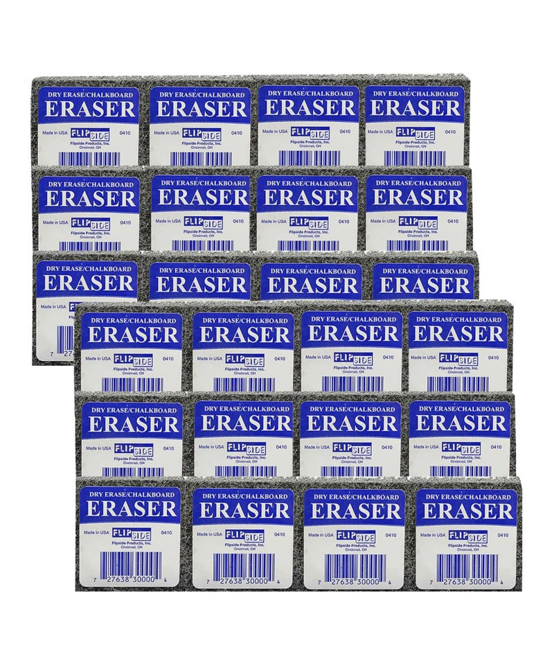 Erasers for dry erase and chalk boards are sized with students' hands mind. One piece dense felt construction will not unravel for extra long use. Works for both dry erase/chalk surfaces. Erasers measure 2" x 2" x 1". Class Pack 12. Made in USA. Sold as a set of 2 packs, 24 erasers total.