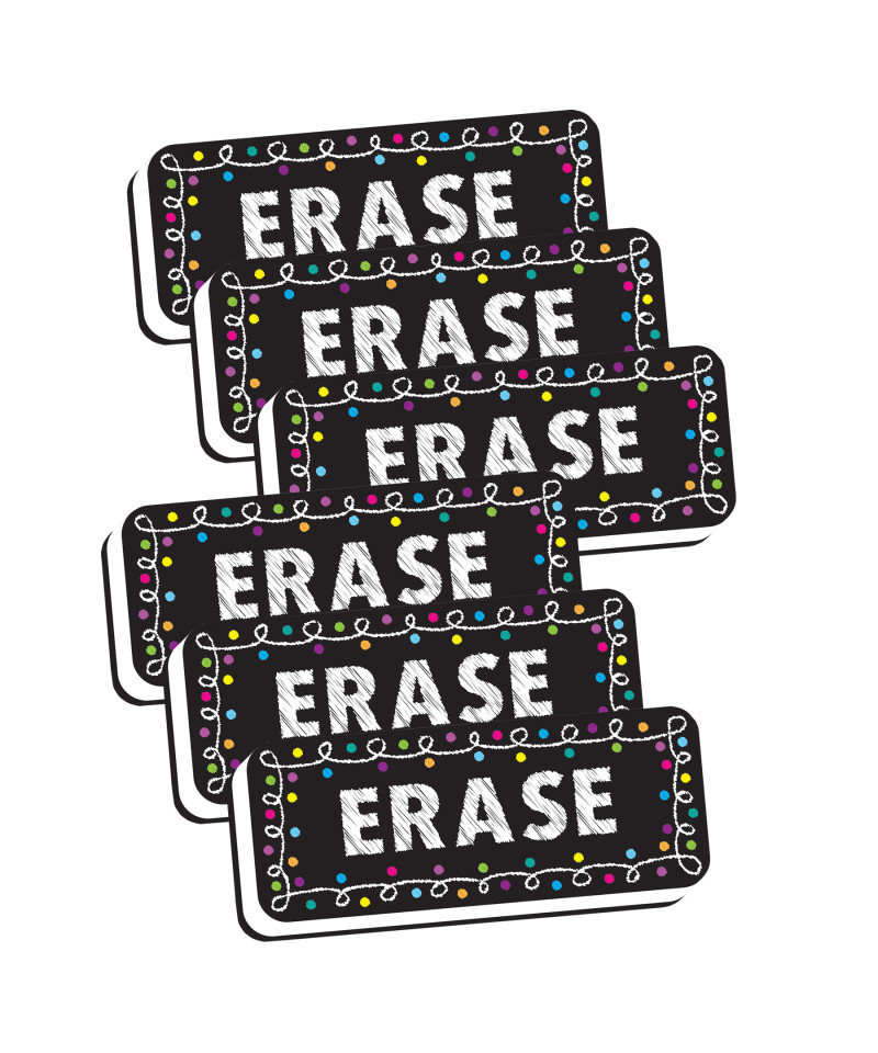 Fun and colorful design to brighten up your magnetic whiteboard. Easy to grip and hold for adults and children. Use with dry erase markers. Eraser is made from a durable foam with a black felt erasing surface. Built in magnet helps to easily stick to magnetic whiteboards and other magnetic surfaces. Measures 2" x 5". Sold as a pack of 6 erasers.