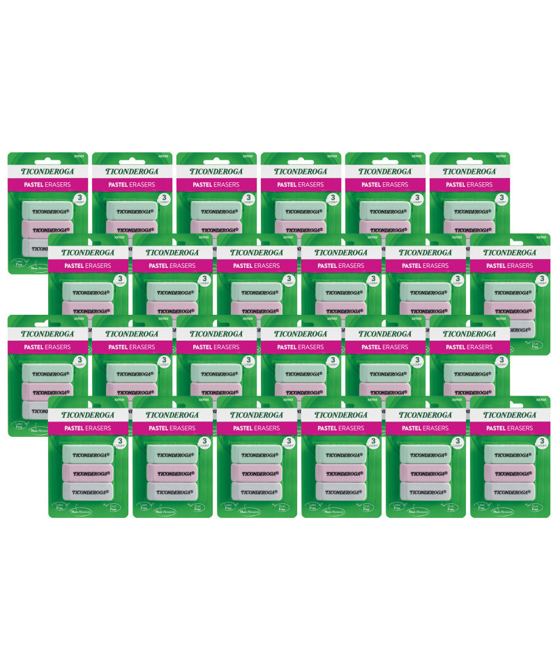 Ticonderoga Pastel Erasers bring a little fun to your home, school or office, while still delivering the same great Ticonderoga performance you expect. Beveled edges give you ultimate control over what you remove from the surface. These soft, latex-free pastel erasers cleanly remove black pencil marks, leaving you with a clear, smudge-free surface and minimal residue. PMA certified non-toxic. Easers measure 2-5/16" x 13/16" x 7/16". Each pack contains 3 medium size, hand-held erasers in assorted pastel colors. Sold as 24 packs for a total of 72 erasers.