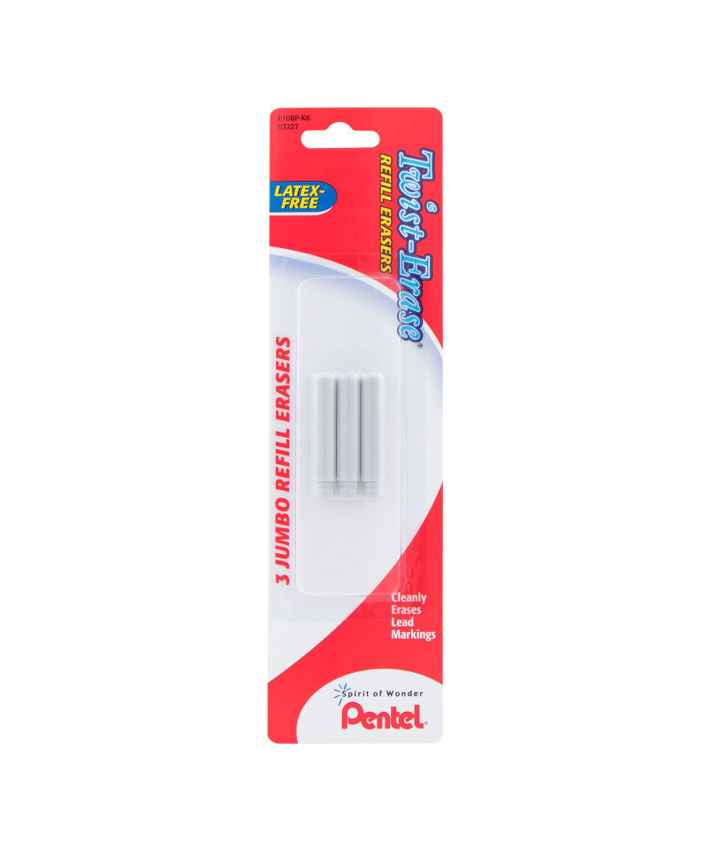 Refill eraser fits all Twist-Erase Series mechanical pencils. Jumbo non-abrasive refill erasers are larger than all ordinary pencil erasers. Cleanly lifts graphite lead markings off paper without scratching, tearing, or ghosting. Refill for the following pencils: Side FX, Twist-Erase CLICK, Twist-Erase EXPRESS, and Twist-Erase III. Each pack includes 3 erasers. Sold as 6 packs for a total of 18 eraser refills.