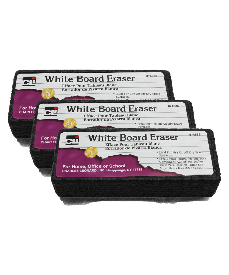 Keep your whiteboards spotless with this high-quality dry erase eraser featuring a soft, plush surface that removes markings quickly and cleanly. Designed for use on all dry erase surfaces, it effortlessly wipes away ink without leaving residue or streaks. Durable and long-lasting, this eraser can be easily cleaned with soap and water, ensuring it stays fresh and effective use after use. Perfect for classrooms, offices, or home learning spaces, it's a must-have tool for any dry erase setup. Sold as a pack of 3 erasers.