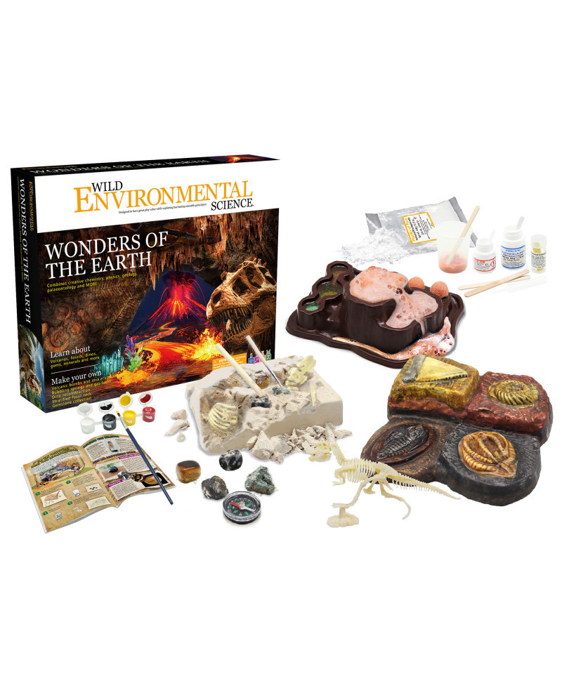 Explore geology, physics and chemistry in the Wonders of the Earth kit. Learn about Earth's rock cycle and crystallize minerals. Learn about paleontology - the study of fossils and prehistoric life. Make a volcano with lava flows, mineral springs, poison-gas lakes and more. Make and paint your own fossil boulder that splits in half and shows key fossils from four different ages. Excavate a high-quality T. rex skeleton and semi-precious gemstones. Use science to test real minerals and conduct experiments! The kit includes high-quality chemical ingredients, science tools and more. The Ingredients are packaged in no-spill, resealable containers so children can conduct experiments again. For ages 8+.