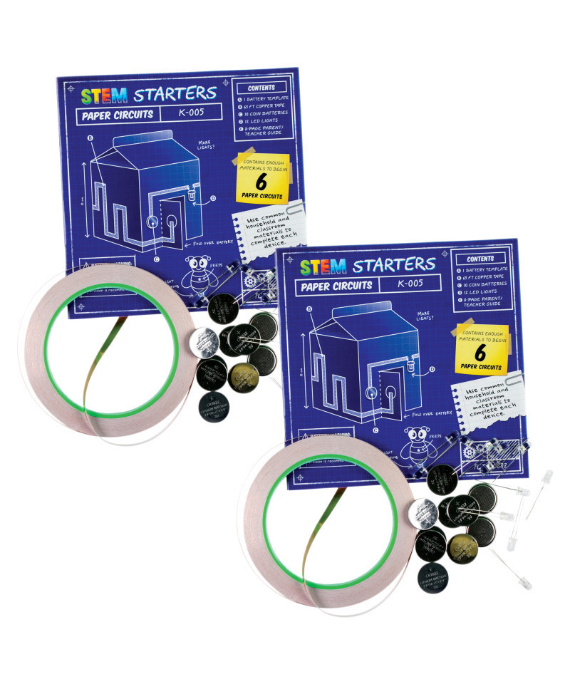 This Paper Circuits activity kit challenges students to create a working circuit. The essential pieces—copper tape, coin batteries, and LED lights—are provided; it's up to the young scientists to determine what type of structure to build and how they can bring it to life with lights. Ages 14+. Each set includes 24 pieces, enough materials to begin 6 paper circuits. Sold as a pack of 2 complete sets.