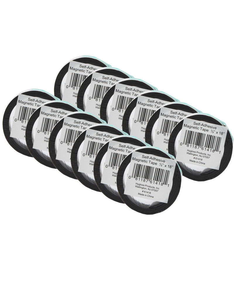 A must have for every home and classroom, Hygloss Self-Adhesive Magnetic Tape is perfect for allowing almost anything to stick to a metal surface like a desk, dry-erase board, locker or refrigerator. Cut to any size, then peel and stick to virtually any material: wood, metal, paper or plastic, to turn all your kids crafts into decorations for any magnetic surface. You can also use it to hang business cards or notices on the refrigerator. Teaching is made easy with magnetic tape; attach a strip of magnet to word strips or classroom decorations to easily display on a dry erase board. Sold as a pack of 24 rolls, each measuring 0.5" x 8".