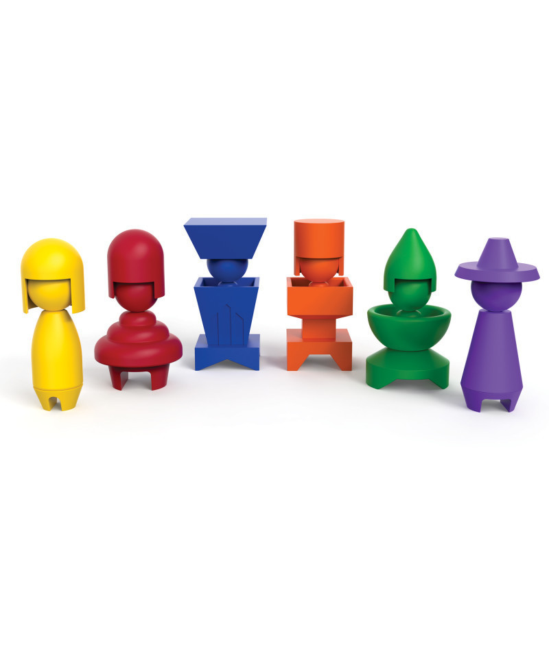 Explore stacking, logic, and emotion building skills! Each set features six captivating geometric dolls, crafted from four stackable pieces molded from recycled plastic. Encourage young minds to explore creative possibilities by matching their dolls to the included cards or inventing their own imaginative combinations. These dolls aren't just for play -- they're conversation starters, sparking discussions about moods and emotions, fostering empathy and understanding. Includes 6 dolls up to 2" x 3-1/2″ (5 x 9 cm) when assembled.
