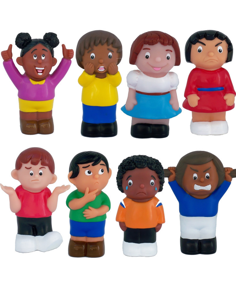 Set of 8 chunky 5.5" multicultural friends with feelings figures are soft and easy to relate to. The characters promote discussion and understanding of feelings and emotions in early childhood settings through creative play. Approximate size of each figurine is 5.5" x 2" x 2". Great for home, day care and preschool use.