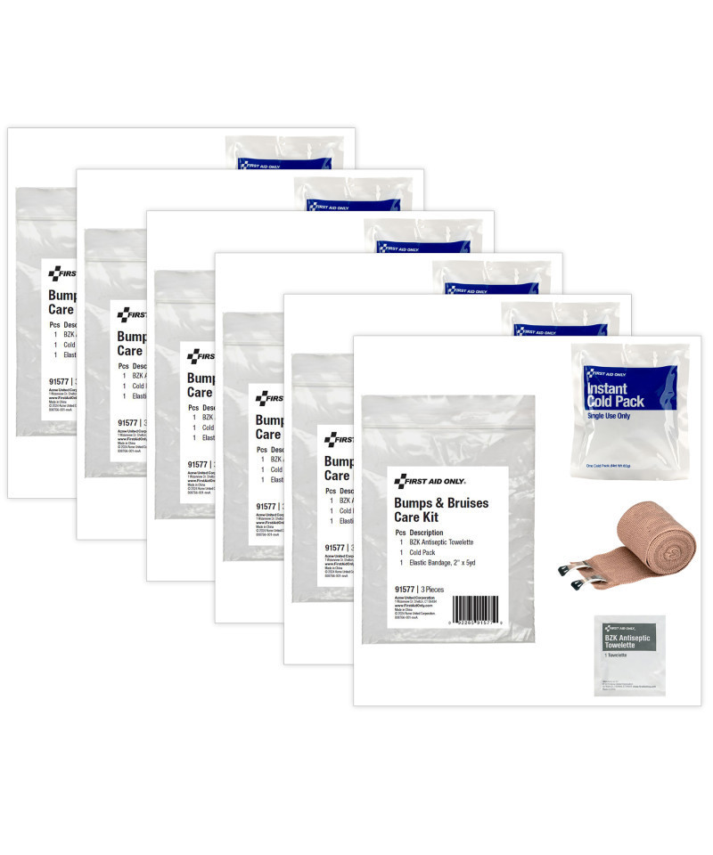 Handle bump and bruise injuries with ease with this Bumps & Bruises Care Kit. Perfectly portioned to contain just what you need to treat minor bumps or bruises, the single use pack may be discarded after use. Refills the 91575 Care Kit or supplements existing first aid kits. Contains 1 x BZK Antiseptic Towelettes, 1 x Cold Pack, and 1 x Elastic Bandage, 2" x 5yd. Sold as a pack of 6.
