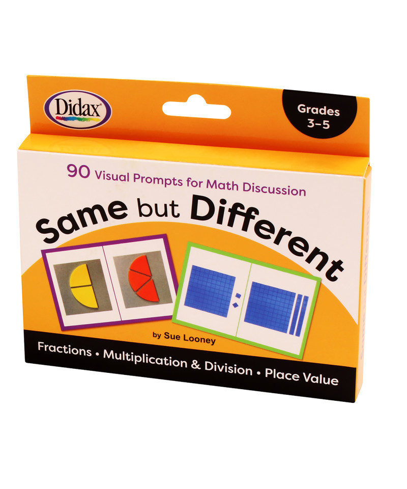 These colorful cards will inspire dynamic mathematical conversations. Using photographs, illustrations, equations and more each card features a content-rich image comparison. Ask students to explore the math by asking, "What is the same? What is different?" about the two images. The ensuing mathematical discussions allow conceptual understanding and connections between mathematical ideas. Display the cards for whole-class instruction, set them up in centers or use for small- group instruction. Each set includes a total of 92 cards; 30 cards in each of the three domains (Fractions, Multiplication & Division, and Place Value) as well as two blank cards to create your own images. Each card measures 4" x 6".