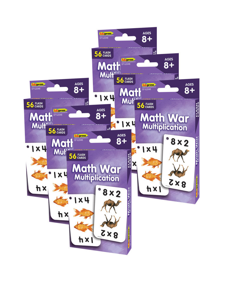 Teach and review multiplication facts with this fun card game! Each flash card set contains a collection of full-color, high-interest student cards as well as instructions and tips for the teacher or parent, suggested activities, and additional blank cards. Each card has a hole in the top corner that can be fit with a ring or string to help with organization and storage. Additionally, each card has one corner that is shaped differently than the others. By lining up the non-rounded corners, the flash cards can quickly be faced in the same direction. When applicable, flash card sets include answers in small print on the reverse side of each card. Each card measures 3-1/8" x 5-1/8". Each pack includes 56 double-sided cards. Sold as 6 identical packs of flash cards.